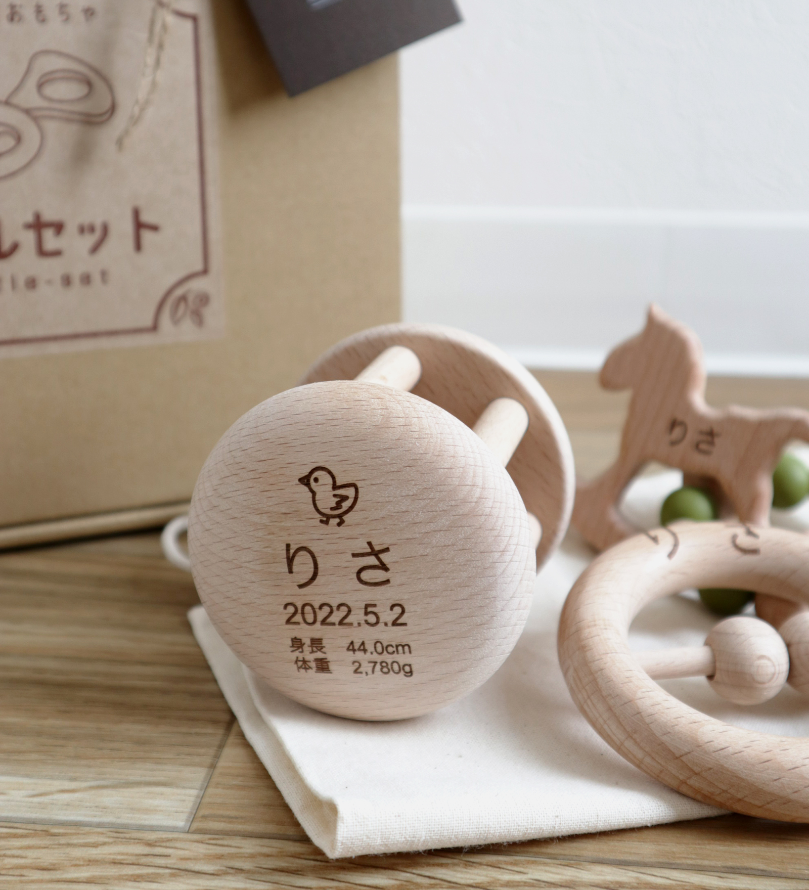 ラトルセットは木のぬくもりが温かく、口に入れても安心なおもちゃ。